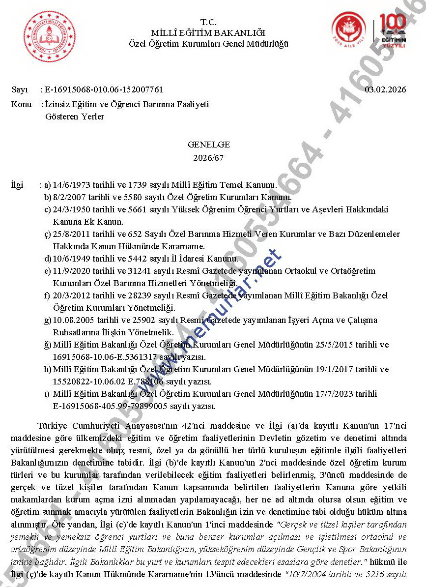 Milli Eğitim Bakanlığı Özel Öğretim Kurumları Genel Müdürlüğü, "İzinsiz Eğitim ve Öğrenci Barınma Faaliyeti Gösteren Yerler" hakkında yeni tedbirler alan 03.02.2026 tarih, 152007761 sayılı ve 2026/67 genelge yayımlandı