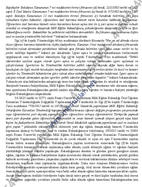 Daha önce Anayasa Mahkemesince verilen Belediyelerin anaokulu açamayacaklarına ilişkin karar gereği, okul öncesi dönemdeki çocuklara eğitim vermek amacıyla yerler açamayacakları veya farklı adlar altında eğitim hizmetini sunamayacakları açıktır. Ancak buna rağmen özellikle belediyeler başta olmak üzere gerçek ve tüzel kişiler tarafından okul öncesi ve ilköğretim çağındaki çocuklara yönelik farklı adlar altında eğitim hizmetinin Bakanlığımızdan izin alınmaksızın verildiği anlaşılmaktadır. Ayrıca gerçek/tüzel kişilerce ilgili düzenlemelere rağmen yurt dışı eğitim danışmanlığı hizmetinin Bakanlığımızca belirlenen usul ve esaslara uyulmaksızın yürütüldüğü görülmektedir.
