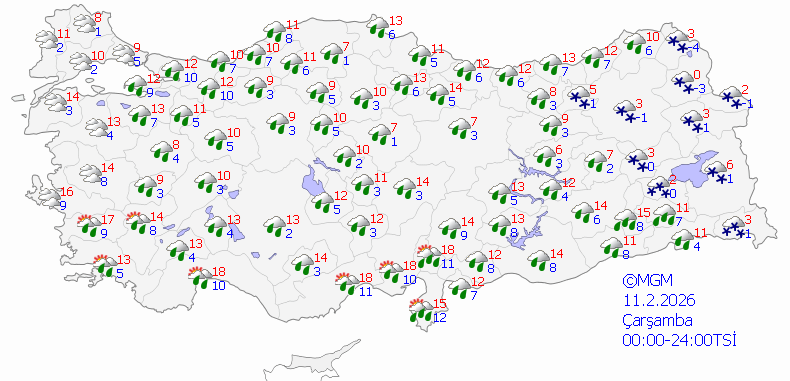 Meteoroloji Genel Müdürlüğü olarak yapılan değerlendirmelere göre: Ülkemiz genelinin parçalı ve çok bulutlu, Marmara, Ege, Batı Akdeniz, İç ve Doğu Anadolu'nun kuzey ve doğusu, Karadeniz ve Güneydoğu Anadolu'nun doğusu ile Hatay kıyılarının aralıklı yağışlı geçeceği tahmin ediliyor. Genellikle yağmur ve sağanak, Doğu Anadolu'nun kuzey ve doğusu, İç Anadolu'nun doğusunun yüksekleri ile Doğu Karadeniz'in yükseklerinin karla karışık yağmur ve kar şeklinde görülmesi beklenen yağışların Doğu Karadeniz ve Güneydoğu Anadolu'nun doğusu ile Doğu Anadolu'nun güneydoğusunda yer yer kuvvetli olması bekleniyor.