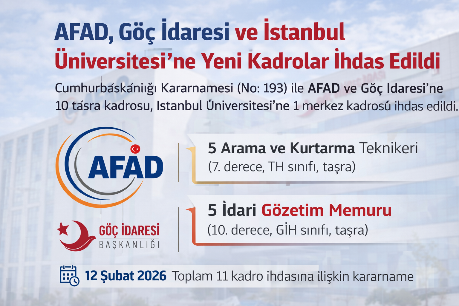 Cumhurbaşkanlığı Kararnamesi (No: 193) ile AFAD ve Göç İdaresi'ne 10 taşra kadrosu, İstanbul Üniversitesi'ne 1 merkez kadrosu ihdas edildi. Kararname 12 Şubat 2026 itibarıyla yürürlüğe girdi.