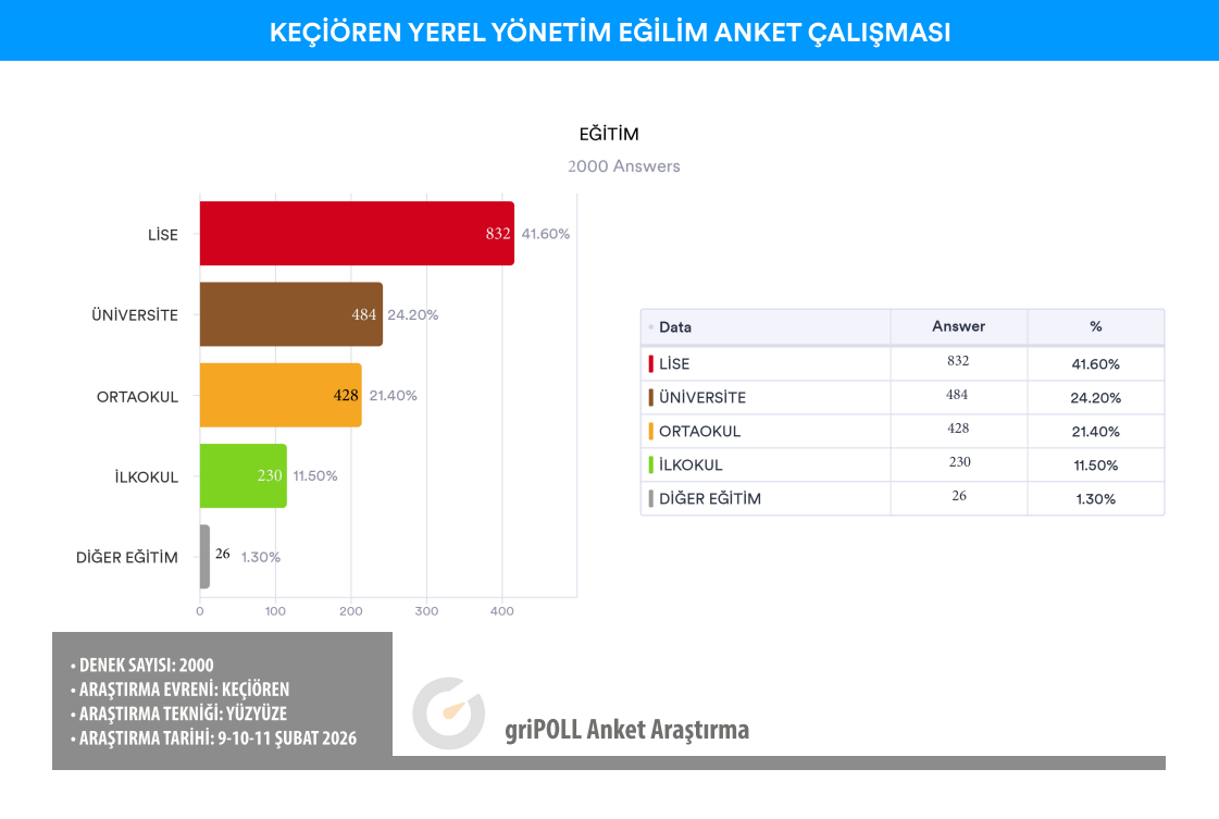 Anket, Keçiören'de 2000 katılımcıyla, yüz yüze görüşme tekniğiyle 9-10-11 Şubat 2026 tarihlerinde gerçekleştirilmiştir.