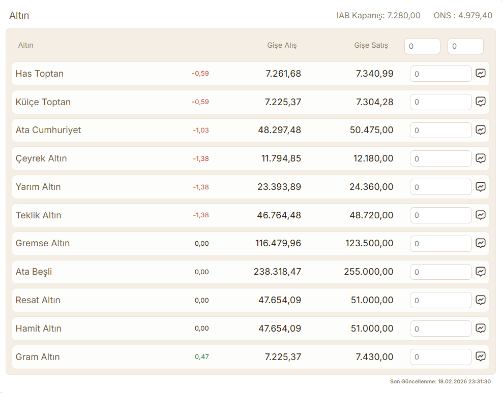 İşte 19 Şubat 2026 Perşembe gününün ilk saatlerinde güncel altın fiyatları tablosu.