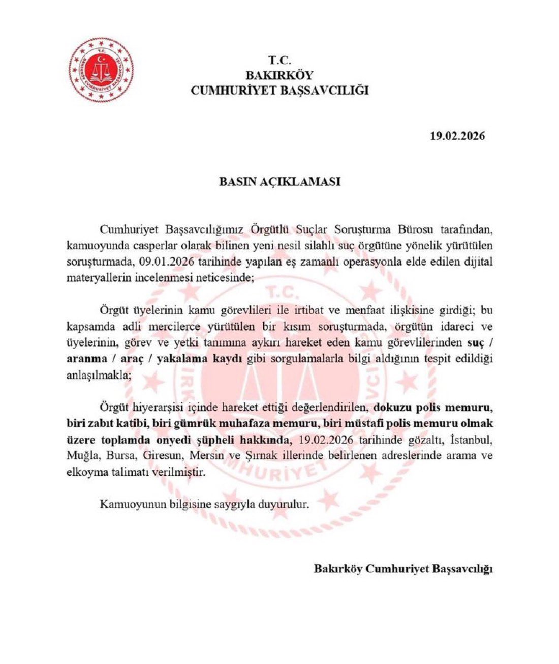 Bakırköy Cumhuriyet Başsavcılığından yapılan açıklamada, Örgütlü Suçlar Soruşturma Bürosunca kamuoyunda "Casperlar" olarak bilinen yeni nesil silahlı suç örgütüne yönelik yürütülen soruşturma kapsamında 9 Ocak'ta düzenlenen eş zamanlı operasyonla elde edilen dijital materyallerin incelendiği belirtildi.