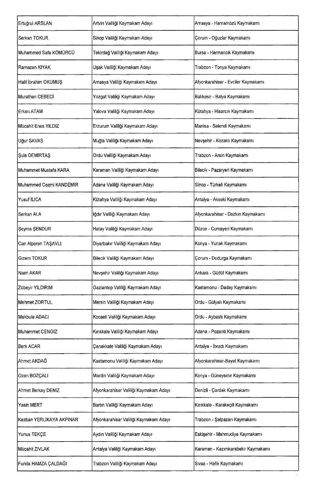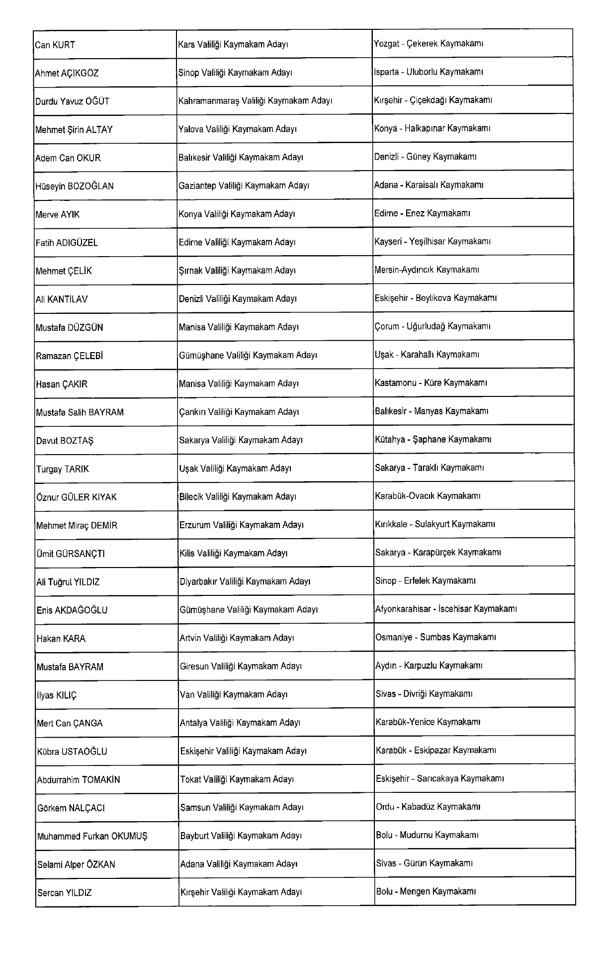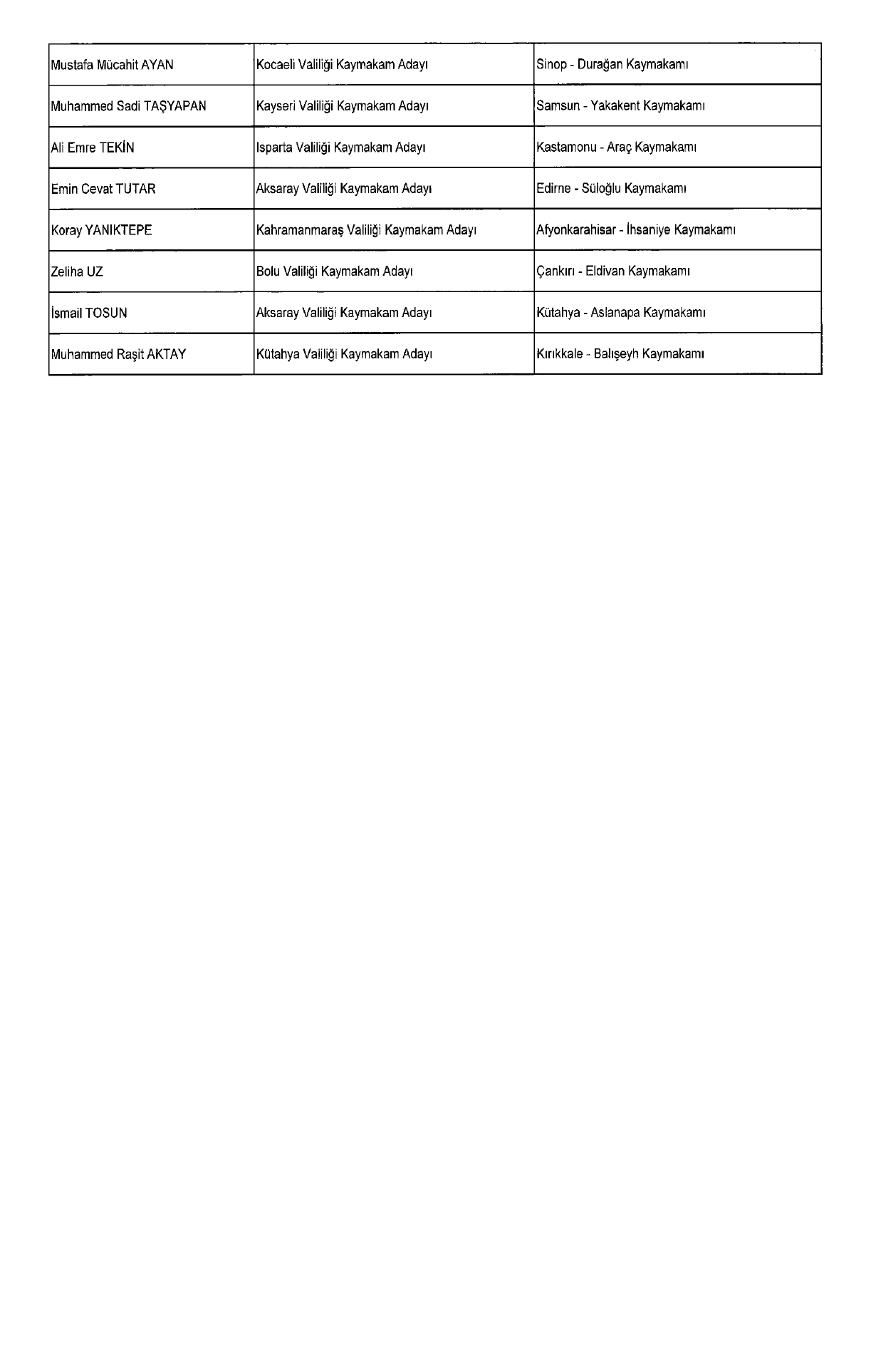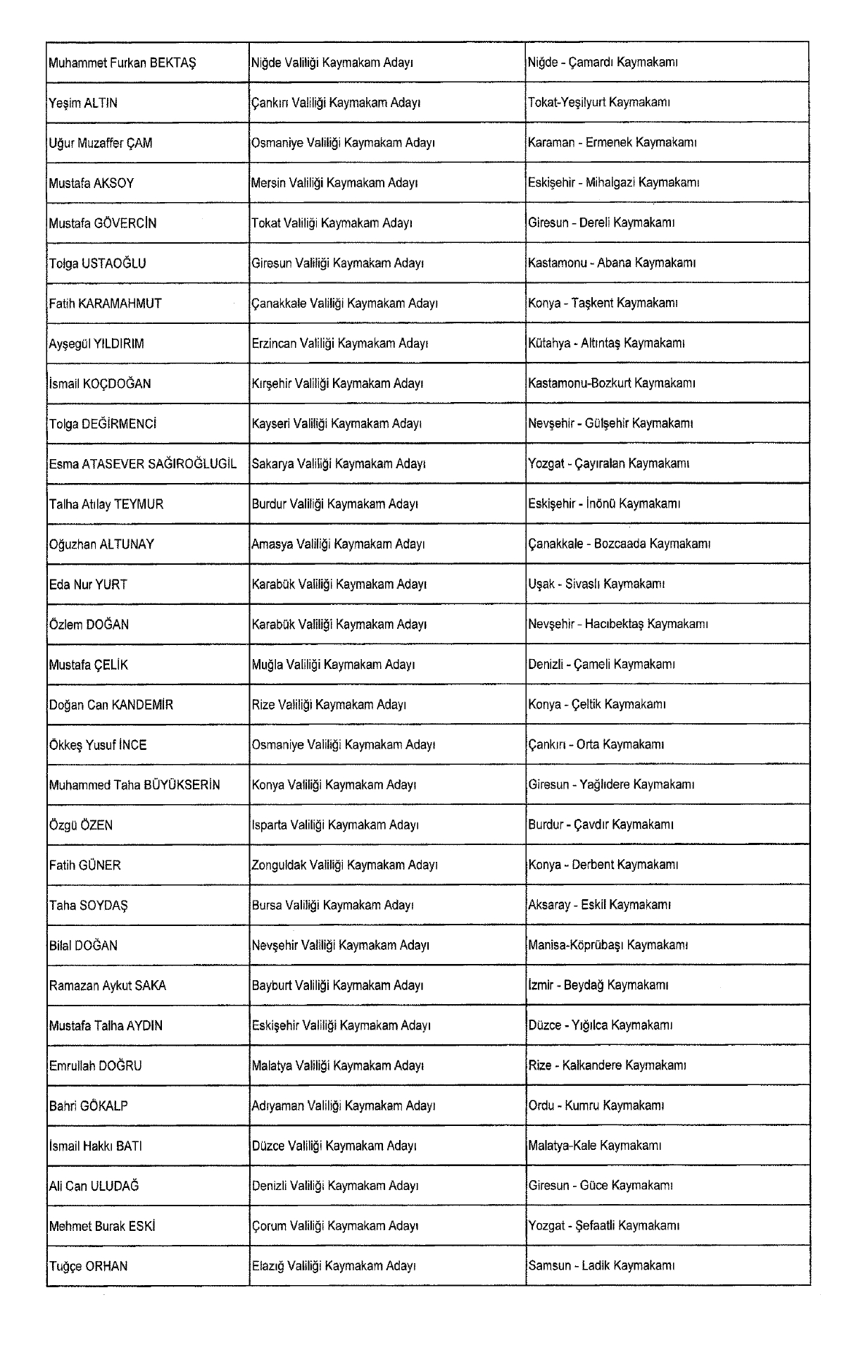 Ekli listede yer alan kişiler, 3 sayılı Cumhurbaşkanlığı Kararnamesinin 2 nci maddesi gereğince hizalannda belirtilen görevlere atanmıştır.