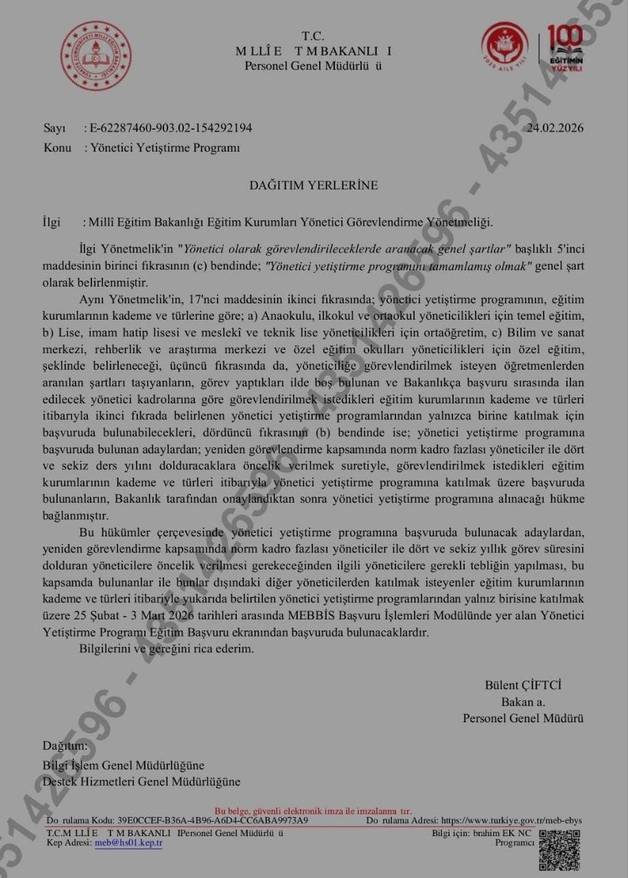 Milli Eğitim Bakanlığı, eğitim kurumlarına yönetici olarak görevlendirilecek öğretmenler için düzenlenecek yönetici yetiştirme programına başvuruların 25 Şubat-3 Mart 2026 tarihleri arasında alınacağını açıkladı.