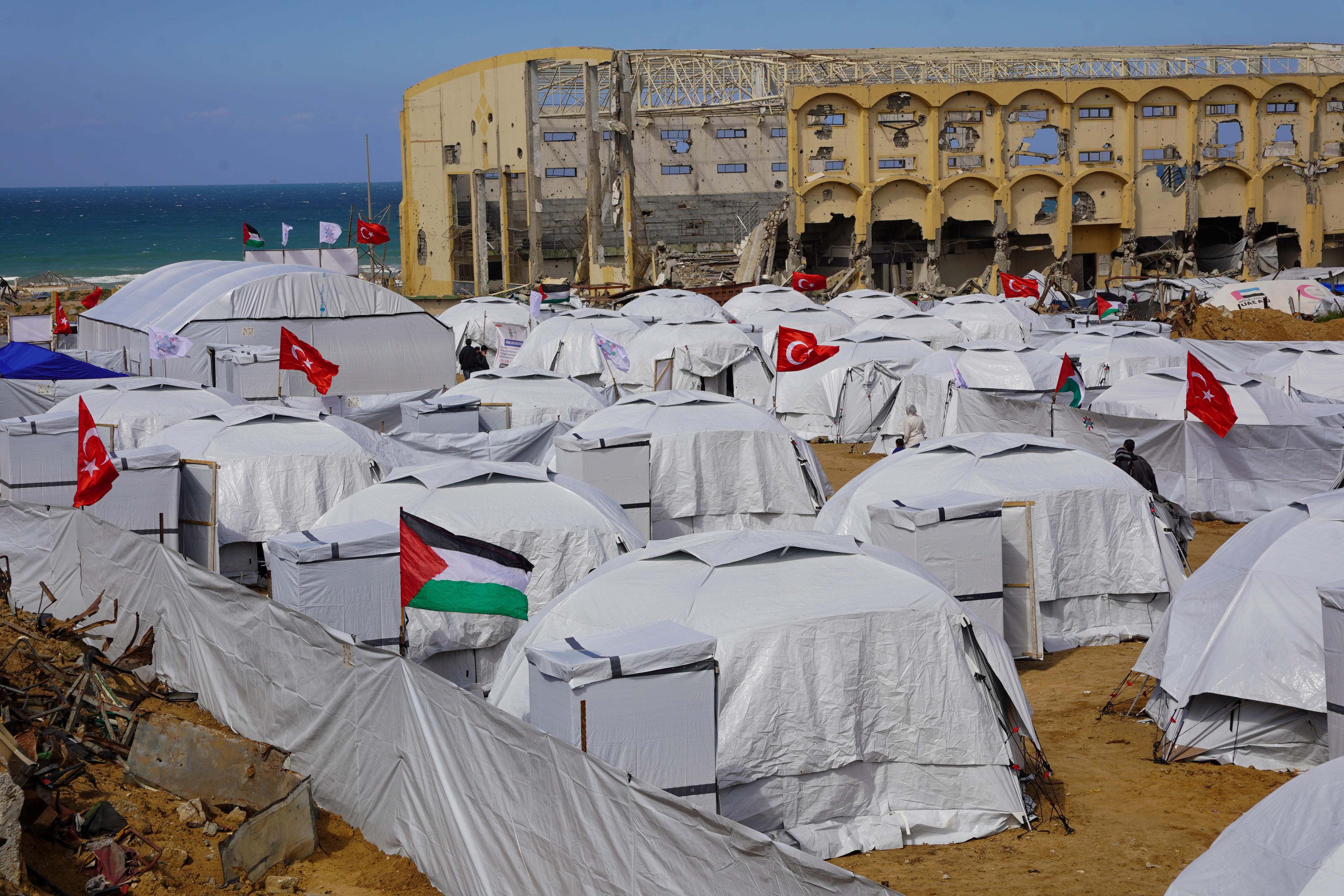 Sanatçı Yıldız Tilbe'nin bağışıyla, İsrail saldırılarında ağır yıkıma uğrayan Gazze Şeridi'nde evlerini kaybeden Filistinliler için kurulan ikinci çadır kent hizmete açıldı.