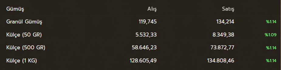 Gram gümüş güne 124,98 liradan başladı. Gün içinde en düşük 123,55 lira, en yüksek de 126,71 lira seviyesi görüldü. Şu sıralar 126,29 liradan alıcı buluyor.