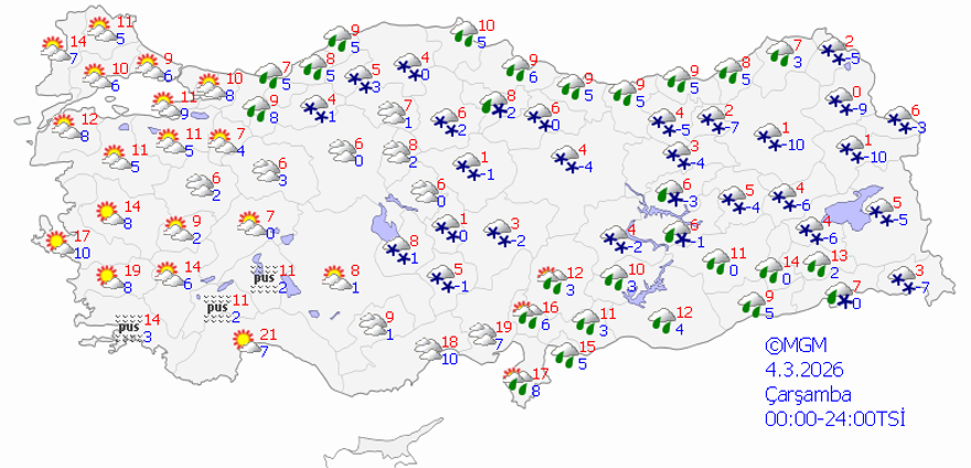Pazar günü Doğu Karadeniz ile Kars, Ardahan ve Iğdır çevrelerinde devam edecek yağışlar yeni haftanın başında kesilecek. Yurt genelinde güneşli ancak soğuk bir hava hakim olacak. Çarşamba gününden itibaren ise batı illeri dışında yurt geneli yeni bir yağışlı sistemin etkisi altına girecek. İç ve doğu kesimlerde yine kar, Karadeniz ve Doğu Akdeniz kıyılarında ise yağmur bekleniyor.