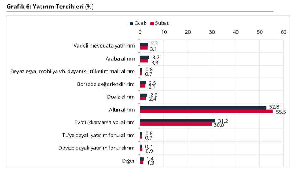 TCMB'nin ilk kez yayımladığı şubat ayı anketine göre hane halkının gelecek 12 ay için yatırım tercihleri; altın, gayrimenkul, araba, vadeli mevduat ve döviz olarak belirlendi.