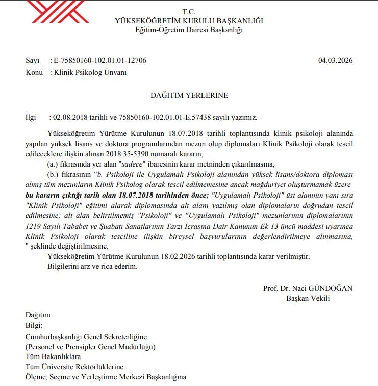 Yükseköğretim Kurulu Başkanlığı, Klinik Psikolog ünvanı verilmesine ilişkin kararında güncellemeye gitti!