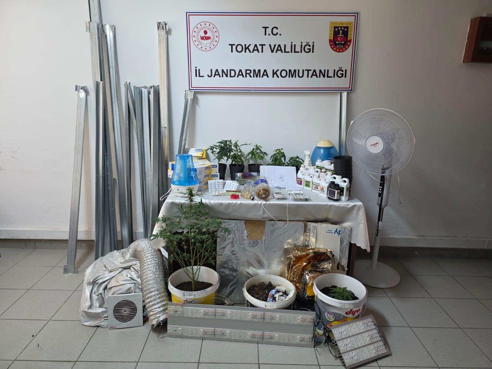 Tokat'ta apartman dairesinde kurdukları serada kenevir yetiştirdiği iddiasıyla gözaltına alınan 2 şüpheliden 1'i tutuklandı. Dairedeki aramada, sera çadırı ve serada kullanılan malzemeler ile farklı ebatlarda kenevir bitkisi, 50 gram kurutulmaya bırakılmış kubar esrar, uyuşturucu öğütme aparatı, 85 reçeteye tabi sentetik ecza hapı ve 3 sayfa kenevir yetiştiriciliğine dair el yazısı bilgi notu ele geçirildi.