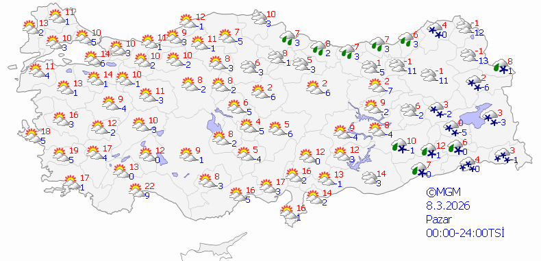 Meteoroloji Genel Müdürlüğü olarak yapılan değerlendirmelere göre: Yurdun kuzey ve doğu kesimlerinin parçalı ve yer yer çok bulutlu, Orta ve Doğu Karadeniz kıyıları ve Doğu Anadolu'nun güneydoğusu ile Güneydoğu Anadolu'nun doğusunun yağışlı geçeceği, yağışların kıyılarda yağmur, iç kesimlerde karla karışık yağmur ve kar yağışı şeklinde görüleceği tahmin ediliyor.