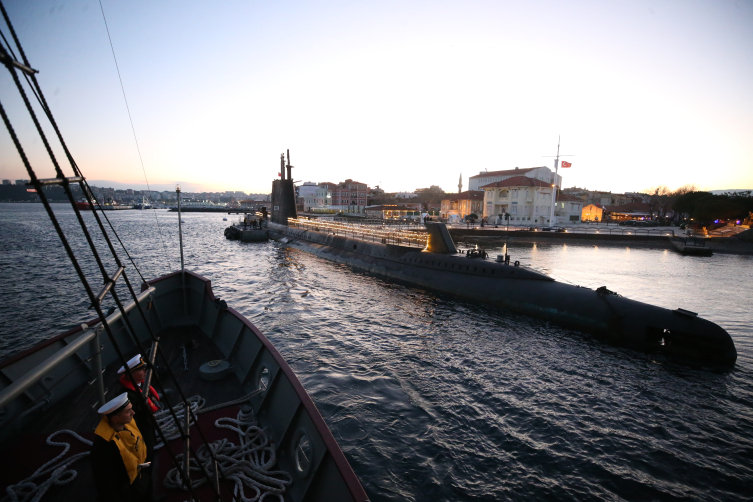 Çanakkale Deniz Müzesi Komutanlığı Yüzer İskelesi'nde demirli bulunan "TCG Nusret (N-16)", mayınlarını döktüğü rotada ilerledi.
