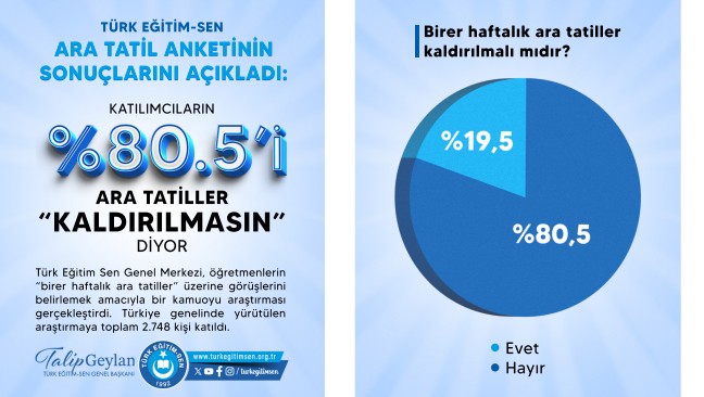 Türk Eğitim-Sen, ara tatil uygulamasına ilişkin öğretmenlerin görüşlerini belirlemek amacıyla Türkiye genelinde 2 bin 748 kişinin katılımıyla bir anket gerçekleştirdi. "Birer haftalık ara tatiller kaldırılmalı mıdır?" sorusunun yöneltildiği ankette, katılımcıların yüzde 80,5'i ara tatillerin kaldırılmasına karşı çıkarken, yüzde 19,5'i kaldırılması yönünde görüş bildirdi.