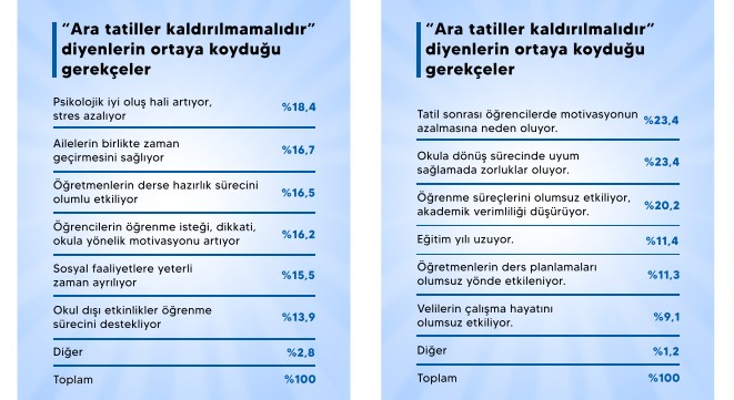 Ara tatilin kaldırılmaması gerektiğini belirten katılımcıların gerekçeleri incelendiğinde en fazla öne çıkan nedenin "psikolojik iyi oluşun artması ve stresin azalması" olduğu görüldü. Bu gerekçenin yüzde 18,4 oranında dile getirildiği ve "hayır" diyen katılımcıların yüzde 82,5'i tarafından paylaşıldığı belirtildi.