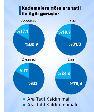 Anket sonuçlarına göre anaokulu ve anasınıfında görev yapan öğretmenlerin yüzde 82,9'u ara tatillerin kaldırılmasına karşı olduğunu ifade ederken, yüzde 17,1'i kaldırılması gerektiğini belirtti. İlkokul kademesinde görev yapan öğretmenlerin yüzde 81,3'ü ara tatilin kaldırılmasına "hayır" yanıtı verirken, yüzde 18,7'si "evet" dedi.
