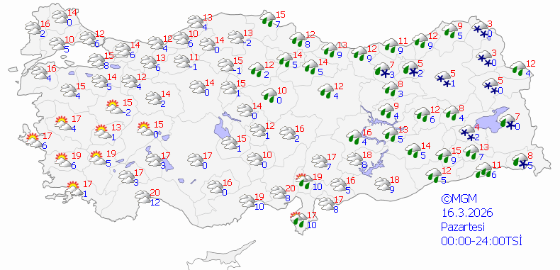 Genellikle yağmur ve sağanak, kıyılarda yer yer gök gürültülü sağanak, Doğu kesimlerde karla karışık yağmur ve yer yer kar şeklinde görülmesi beklenen yağışların, Doğu Akdeniz ve Güneydoğu Anadolu'da kuvvetli yağmur ve sağanak, Bingöl, Muş, Bitlis, Şırnak ve Hakkari çevrelerinde kuvvetli ve yer yer yoğun kar şeklinde görülmesi bekleniyor.
