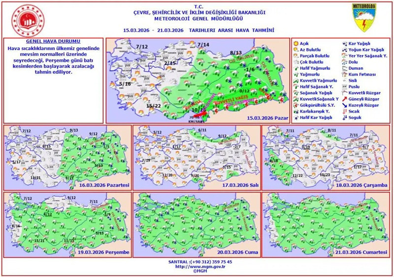 Meteoroloji'nin haritalı değerlendirmesinde yağış beklenen zaman ve iller işaretlenirken, "Hava sıcaklıklarının ülke genelinde mevsim normallerinde seyredeceği, Perşembe günü batı kesimlerden başlayarak azalacağı tahmin ediliyor" değerlendirmesi de belirtildi.