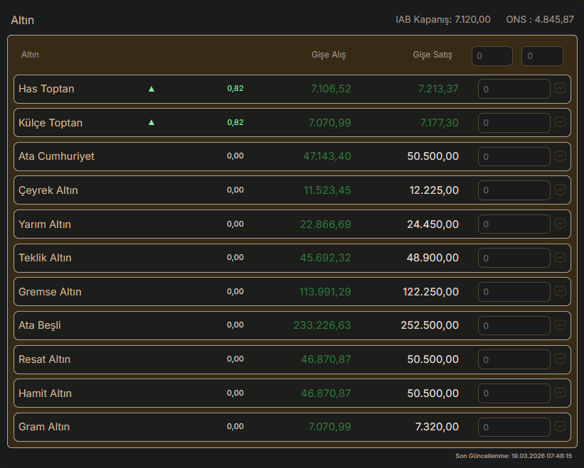 İç ve dış piyasayı etkileyen altın ve döviz kurundaki değişimler merakla takip ediliyor. Vatandaşlar günün ilk saatlerinden itibaren "Gram altın, çeyrek altın, ons altın fiyatı bugün ne kadar?" araştırmaları yapıyor. İşte 19 Mart 2026 Perşembe gününün ilk saatlerinde güncel altın fiyatları tablosu.