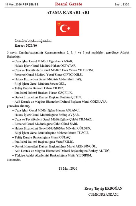 19 Mart 2026 tarihli Resmi Gazete'de yayımlanan atama kararlarıyla Adalet Bakanlığı'nın üst düzey kadrolarında kapsamlı bir değişim gerçekleşti. Cumhurbaşkanı Recep Tayyip Erdoğan'ın imzasıyla yayımlanan 2026/86 sayılı kararname doğrultusunda, birçok genel müdür ve daire başkanı görevden alınırken yerlerine yeni isimler atandı.