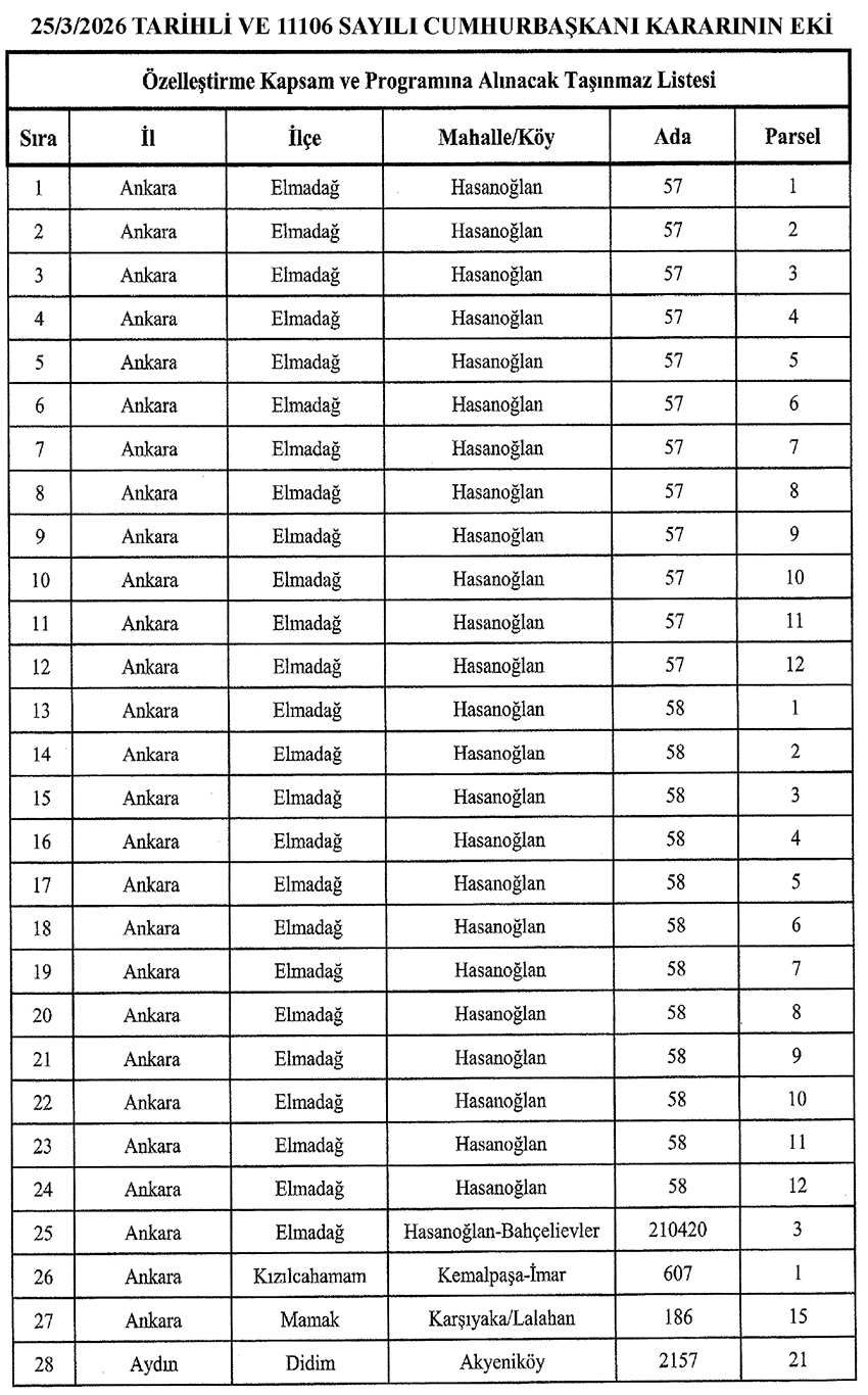 Recep Tayyip Erdoğan'ın imzasıyla yayımlanan karar doğrultusunda, devlete ait 54 taşınmaz özelleştirme kapsamına alındı. Söz konusu varlıkların satışından elde edilecek gelirlerin savunma yatırımlarına yönlendirilmesi hedefleniyor.