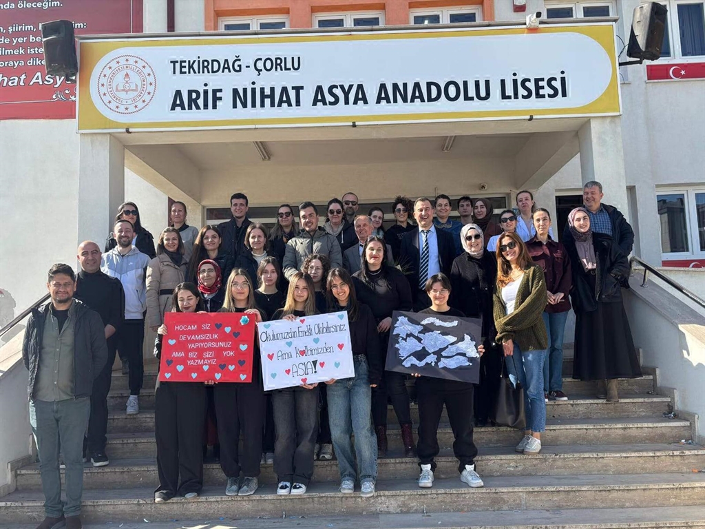 Çorlu Arif Nihat Asya Anadolu Lisesi Müdür Yardımcısı ve fizik öğretmeni Halil İbrahim Akyüz, 40 yıllık mesleğine emekliye ayrılarak veda etti. Akyüz için öğrencileri tarafından okulda sürpriz bir veda programı düzenlendi. Okul koridorunda bir araya gelen öğrenciler, öğretmenlerini alkışlar eşliğinde uğurlarken duygusal anlar yaşandı. Öğrenciler, veda sırasında, 'Okulumuzdan emekli olabilirsiniz ama kalbimizden asla', 'Hocam siz devamsızlık yapıyorsunuz ama biz sizi yok yazmayız' yazılı dövizler açtı.