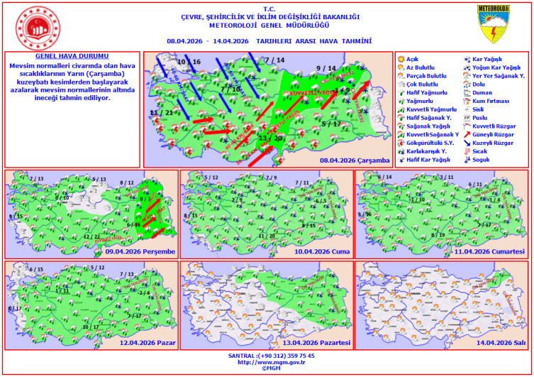 Haftalık rapora göre, bugün Marmara ve Ege üzerinden giriş yapacak olan serin hava ve kuzeyli rüzgarlar, sıcaklıkları hızla düşürecek. İstanbul'da sıcaklıkların 10-16 derece bandına gerilemesi beklenirken, İç Anadolu'da Ankara'da termometreler 7-10 dereceyi gösterecek. Doğu Anadolu'nun iç kesimlerinde ise kuvvetli yağışlar etkili olacak.