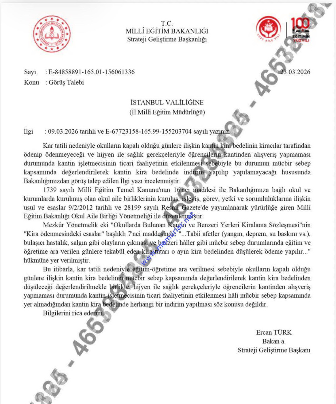 Milli Eğitim Bakanlığı Personel Genel Müdürlüğü 23.03.2026 tarih ve 156061336 sayılı yazısıyla, Kar tatili nedeniyle okulların kapalı olduğu günlere ilişkin kantin kira bedelinin kiracılar tarafından ödenip ödenmeyeceği ve hijyen ile sağlık gerekçeleriyle öğrencilerin kantinden alışveriş yapmaması durumunda kantin işletmecisinin ticari faaliyetinin etkilenmesi sebebiyle bu durumun mücbir sebep kapsamında değerlendirilerek kantin kira bedelinde indirim yapılıp yapılamayacağı hususunda görüş yayınladı.