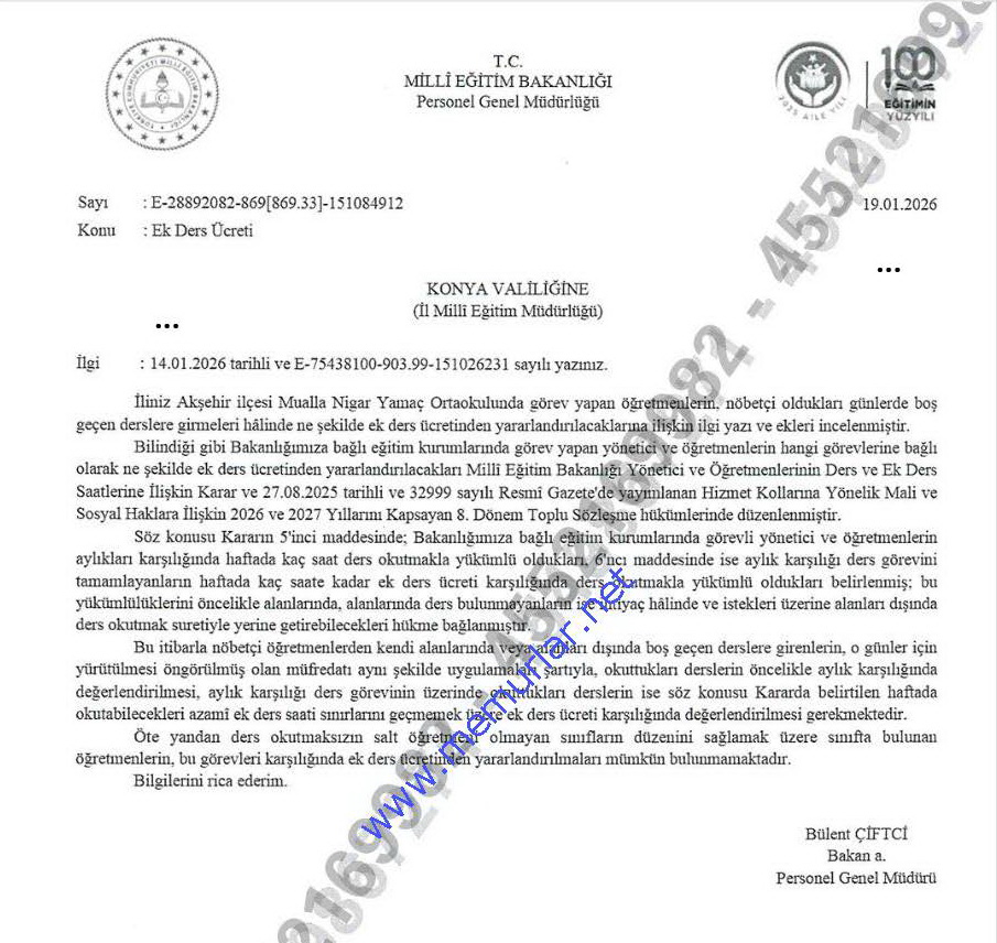 Milli Eğitim Bakanlığı Personel Genel Müdürlüğü 19.01.2026 tarih ve l51084912 sayılı yazısıyla, Öğretmenlerin nöbetçi oldukları günlerde boş geçen derslere girmeleri halinde ne şekilde ek ders ücretinden yararlandırılacakları hususunda görüş yayınladı.