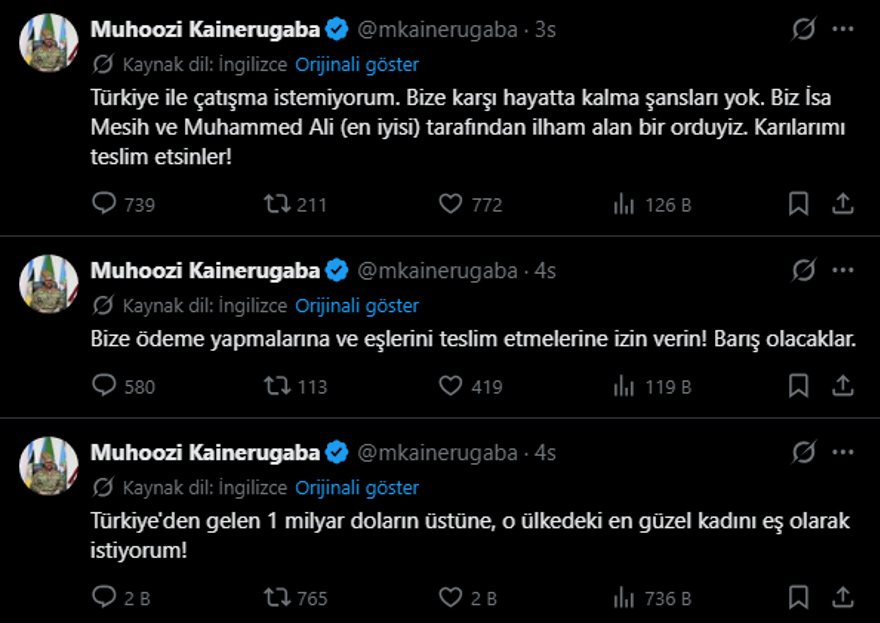 Bu sorunsuz ilişkilere rağmen, kontrolü iyice yitiren Kainerugaba, Türkiye'nin en güzel kadınını da eş olarak istediğini söyledi. Kainerugaba'nın paylaşımları kısa sürede büyük tepki çekti.