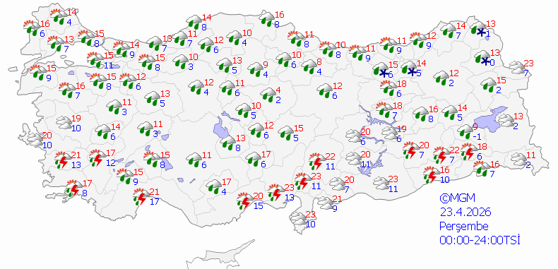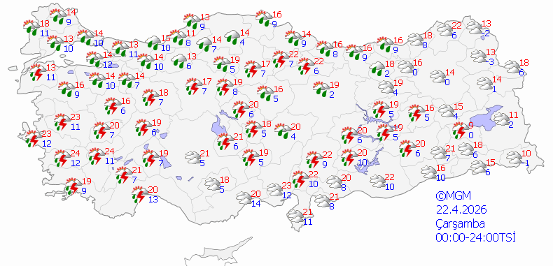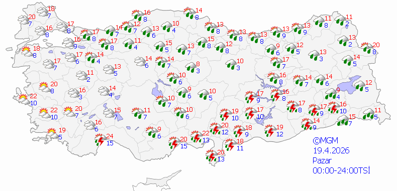 Yağışların, genellikle sağanak ve yer yer gök gürültülü sağanak, Doğu Karadeniz'in iç ve yüksek kesimleri ile Doğu Anadolu'nun kuzeyinde karla karışık yağmur ve kar şeklinde görülmesi beklenen yağışların, Doğu Akdeniz, Güneydoğu Anadolu'nun doğusu ile Bitlis, Şırnak ve Hakkari çevrelerinde yerel kuvvetli olması bekleniyor.