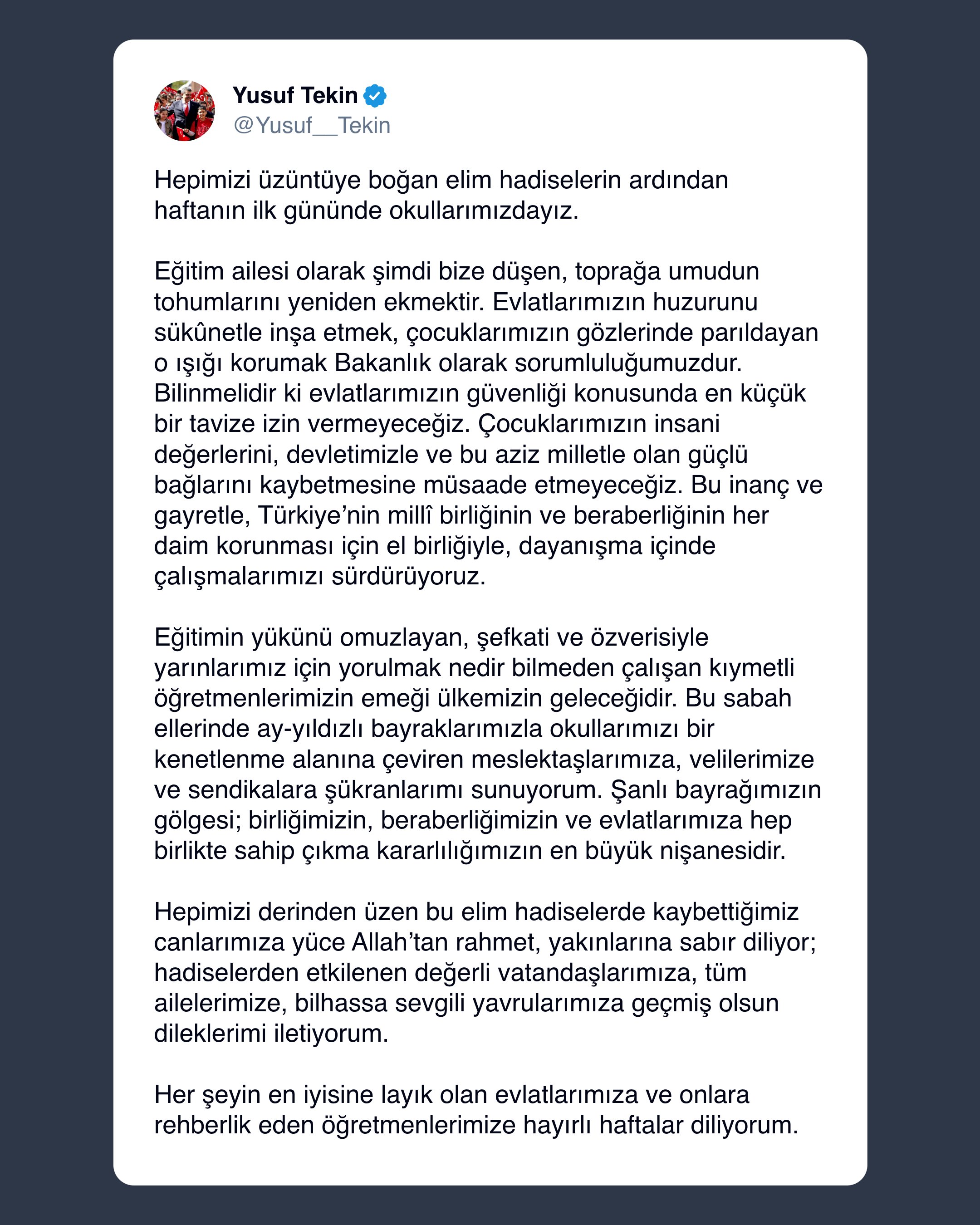Bakan Yusuf Tekin, NSosyal hesabından yaptığı paylaşımda, herkesi üzüntüye boğan elim hadiselerin ardından haftanın ilk gününde okullarda olduklarını belirtti.