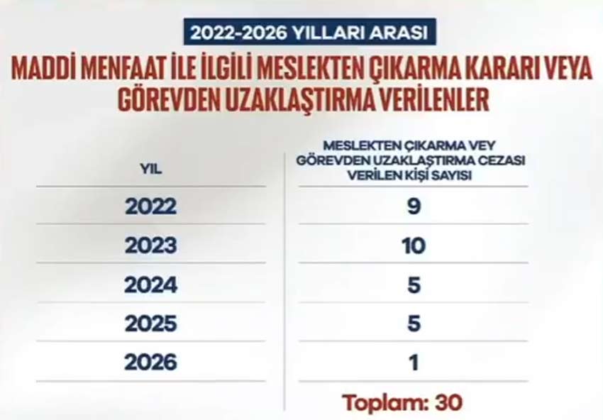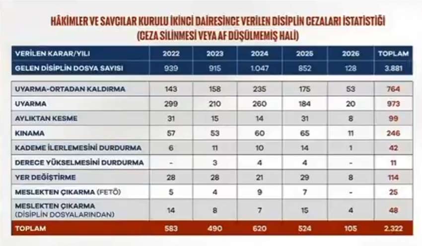2022'den bu yana hakim ve savcılar hakkında açılan disiplin dosyası sayısı 3.881'e ulaştı. Bunların 2.322'si sonuçlandırılarak yaptırım kararına bağlandı. En ağır suçlamalar arasında yer alan maddi çıkar sağlama iddiasıyla ise 30 yargı mensubu görevden ihraç edildi.