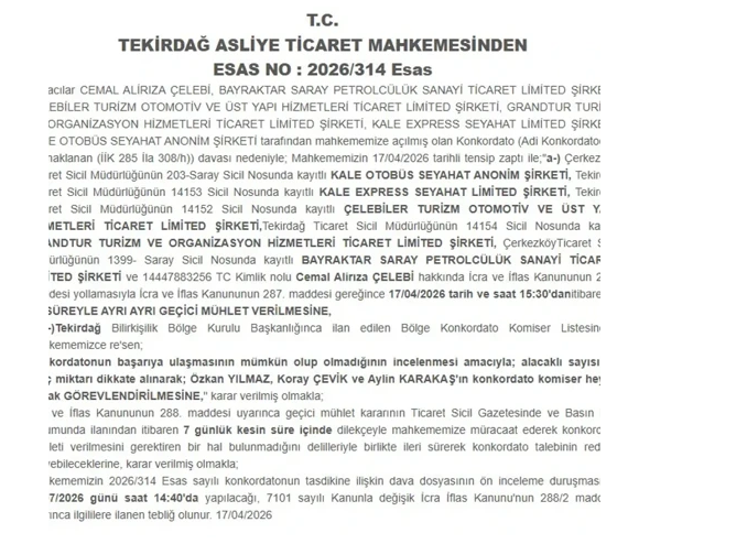 Tekirdağ iş dünyası ve ulaşım sektöründe faaliyet gösteren köklü firmalara ilişkin alınan konkordato kararı bölgede geniş yankı uyandırdı. Tekirdağ Asliye Ticaret Mahkemesi, Kale Seyahat, Kale Express, Kale Otobüs Seyahat ve Bayraktar Saray Petrolcülük için geçici konkordato kararı verildiğini açıkladı.