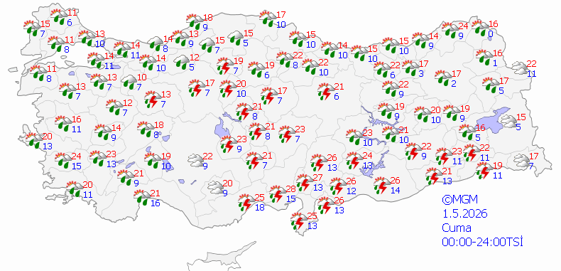 1 Mayıs Cuma günü itibarıyla sıcaklıklarda 5-6 derecelik düşüş beklenirken yurdun büyük bölümünde sağanak yağış etkili olacak.