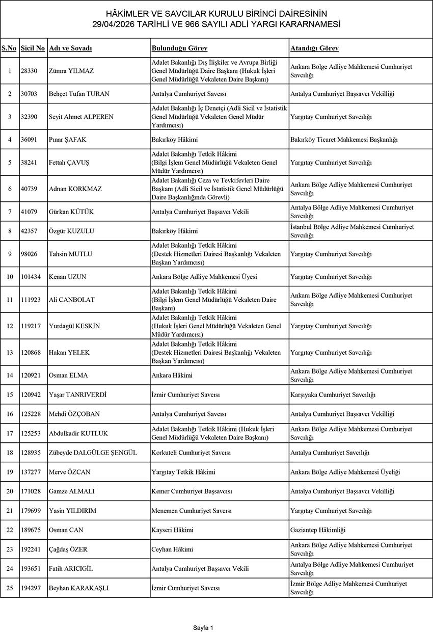 Hakimler ve Savcılar Kurulu (HSK) Birinci Dairesi, 29 Nisan 2026 tarihinde adli yargı mensuplarını kapsayan yeni bir atama kararnamesi yayımladı. 966 sayılı kararname ile 34 hakim ve savcının görev yeri değiştirildi.