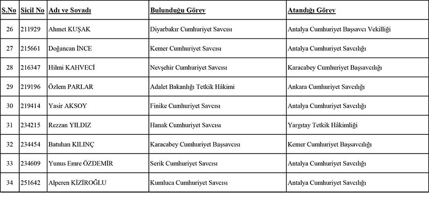 Kararname kapsamında en fazla atama Antalya yargı çevresinde yaşandı. Antalya Cumhuriyet Başsavcı Vekilliği'ne Behçet Tufan Turan, Mehdi Özçoban, Gamze Amalı ve Ahmet Kuşak atanırken; Antalya Cumhuriyet Savcılığı'na Zübeyde Dalgülge Şengül, Doğancan İnce, Yasir Aksoy, Yunus Emre Özdemir ve Alperen Kizizoğlu görevlendirildi. Gürkan Kütük ve Fatih Arıcıgil ise Antalya Bölge Adliye Mahkemesi Cumhuriyet Savcılığı'na getirildi.