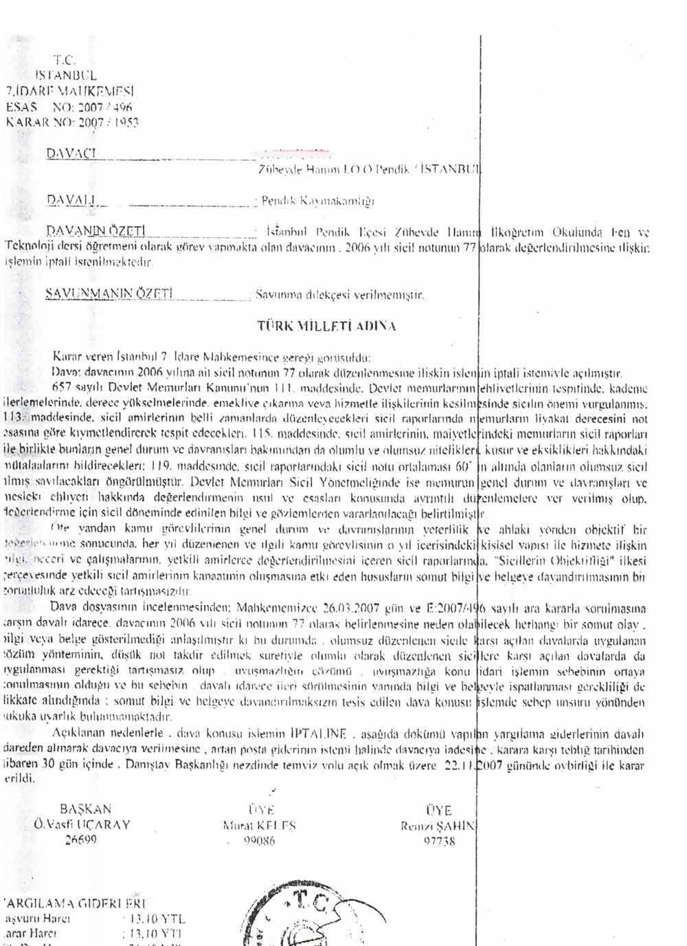 İlçe Milli Eğitim Müdürlüğünden gelen cevabi yazıda önceki yıllara ait sicil notlarının yüksek olmasına rağmen 2006 sicilinin kasıtlı şekilde aşağı çekildiğini ve 77 verildiğini gördü. İstanbul 7. İdare Mahkemesi'ne konu ile ilgili dava açan Aydın Kaya'nın itirazına 7. İdare Mahkemesi 2007/1953 sayılı kararla; ?somut bilgi ve belgeye dayandırılmaksızın tesis edilen dava konusu işlemde sebep unsuru yönünden hukuka uyarlılık bulunmamaktadır.? hükmü vererek düşük sicil notunu iptal etti.