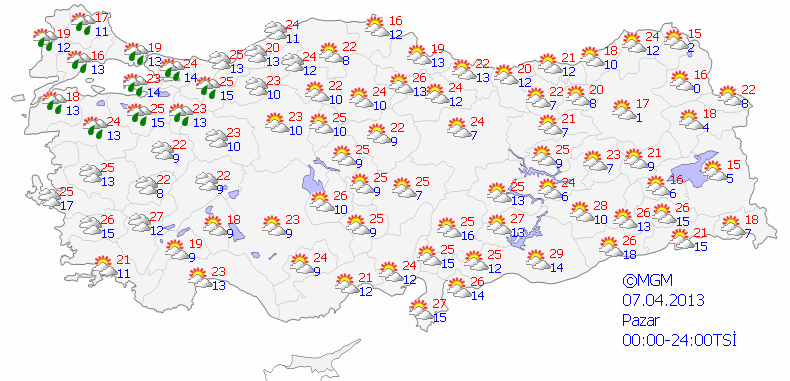 Yapılan son değerlendirmelere göre; Ülkemizin doğu kesimlerinin parçalı ve çok bulutlu akşam saatlerine kadar aralıklı sağanak ve gök gürültülü sağanak yağışlı, batı kesimlerinin ve zamanla ülke genelinin az bulutlu ve açık geçmesi bekleniyor. Sabah saatlerinde Güneydoğu Anadolu'da toz taşınımı bekleniyor.