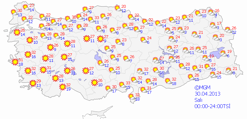 Yapılan son değerlendirmelere göre: Ülke genelinde yağış beklenmiyor. Doğu Anadolu'nun doğusunun parçalı yer yer çok bulutlu, diğer yerlerin az bulutlu ve açık geçeceği tahmin ediliyor.