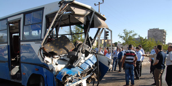Siverek-Şanlıurfa otogar kavşağında gerçekleşen trafik kazasında, 13 kişi yaralandı. Alınan bilgilere göre, Siverek Devlet Hastahanesi personelini taşıyan Serkan B. idaresindeki 01 VR 219 plakalı minibüs, otogar kavşağına geldiğinde freni boşalınca, Kadri K. hakimiyetindeki 35 AH 1852 plakalı kamyona çarptı. Çarpmanın etkisiyle minibüste bulunan Serkan B., Enes Çakır, Ebru Sancak, Baran Altundal, Leyla Garipoğlu, Gülbahar Polat, Tuba Kalenderli, Ömer Şenateş, Osman Aller, Erdal Çiftçi, Pervin Karaaslan, Meral Sun ve Zekiye Avcı yaralandı. Yaralılar olay yerine gelen ambulanslarla Siverek Devlet Hastanesi'ne kaldırıldı. Burada tedavi altına alınan yaralıların sağlık durumlarının iyi olduğu öğrenildi. Kaza yerinde güvenlik önlemi alan polis ekipleri ise, trafik akışını kontrollü sağladı. Araçların yoldan çekilmesiyle birlikte trafik akışı normale dönerken, kamyon sürücüsü de ifadesi alınmak üzere emniyete götürüldü. Servis aracının kaza haberini alan personel yakınları ise hastaneye akın etti. Kazayla ilgili soruşturma başlatıldı.