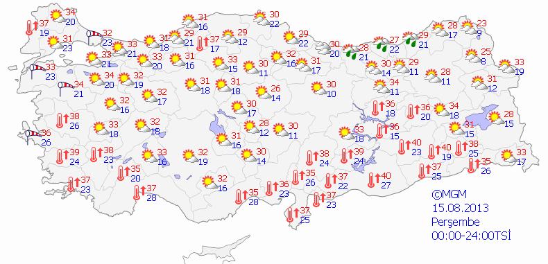 RÜZGAR :Genellikle kuzey ve kuzeydoğu, Akdeniz kıyıları ile Güneydoğu Anadolu'da batı ve güneybatı, Orta ve Doğu Karadeniz kıyı kesimlerinde batı ve kuzeybatı yönlerden hafif arasıra orta kuvvette, Marmara ve Kıyı Ege ile zamanla Hatay çevrelerinde yer yer kuvvetli olarak (30-50 km/saat) esmesi bekleniyor.