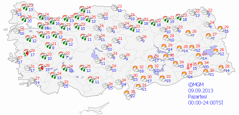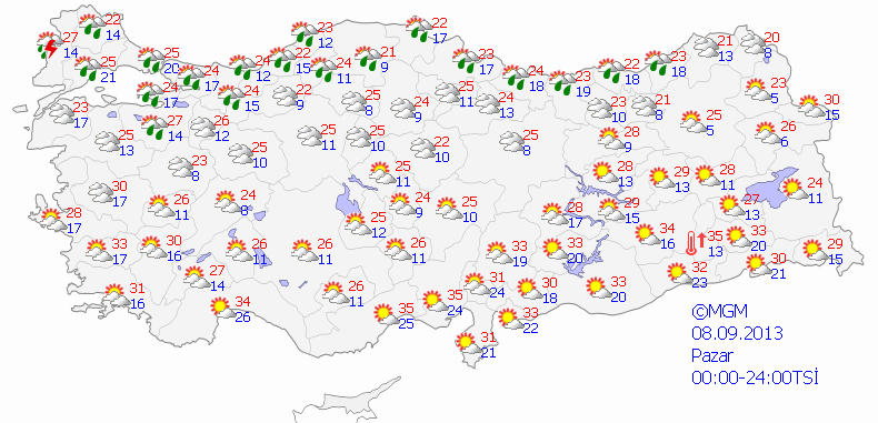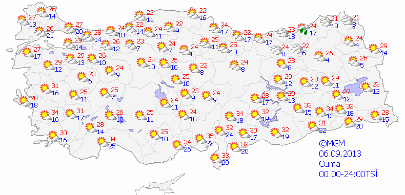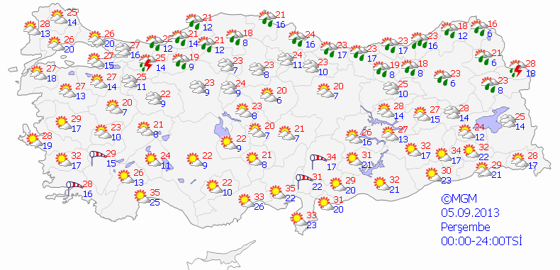 RÜZGAR :Genellikle kuzey ve kuzeybatı, Akdeniz kıyıları, Güneydoğu Anadolu ve Doğu Anadolu'nun güneydoğusunda güney ve güneybatı yönlerden hafif arasıra orta kuvvette, Güney Ege ile Batı ve Orta Karadeniz' de kuvvetli şekilde (40-60 km/saat) esmesi bekleniyor.