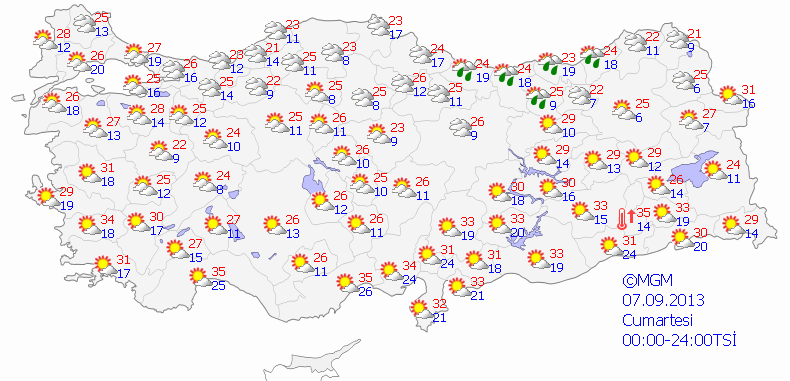 Yapılan son değerlendirmelere göre; Karadeniz Kıyıları, Doğu Anadolu'nun kuzeydoğusu, Sakarya, Bolu, Karabük ve Kastamonu çevrelerinin sağanak ve gök gürültülü sağanak yağışlı geçeceği tahmin ediliyor. Yağışların; Rize ile Artvin'in kıyı ilçelerinde yerel olarak kuvvetli olması bekleniyor.