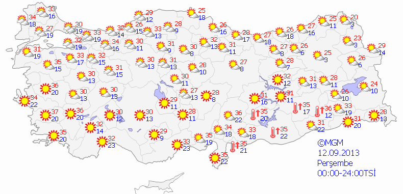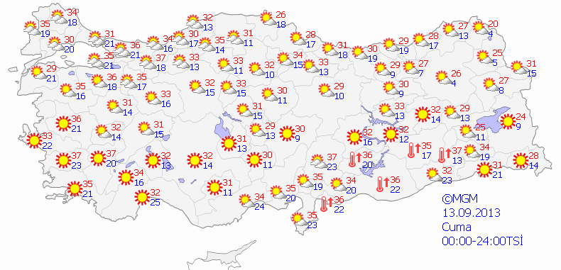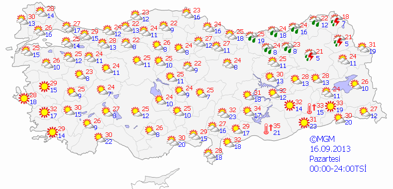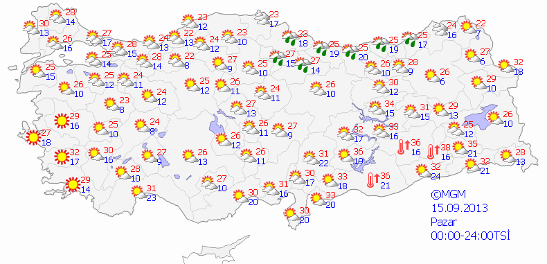 RÜZGAR :Marmara ve Karadeniz kıyılarında doğu ve kuzeydoğu, Akdeniz kıyıları ile zamanla Güneydoğu kesimlerde batı ve güneybatı, diğer yerlerde kuzey ve kuzeybatı yönlerden hafif, ara sıra orta kuvvette, eseceği tahmin ediliyor.