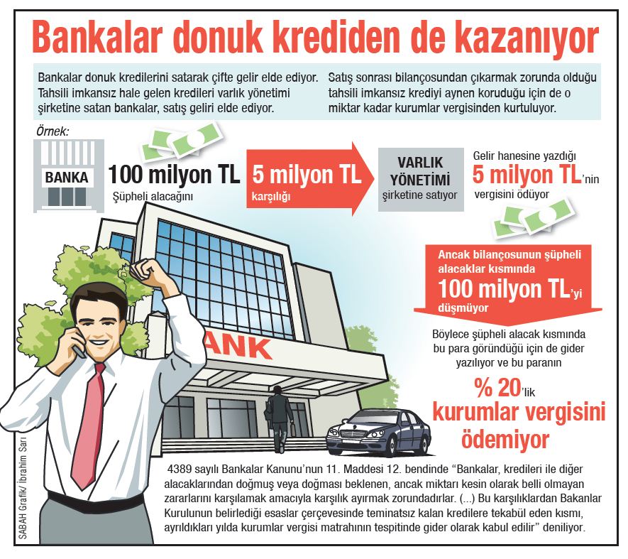 Sistem şöyle çalışıyor: Banka donuk krediyi varlık yönetimi şirketine satıyor ve batık olan paranın bir kısmını kurtarıyor. Bunun da vergisini ödüyor. Ancak şüpheli alacak miktarı bilançosunda tutuyor. Böylece de devlete vermesi gereken kurumlar vergisini ödemiyor. Örneğin, banka 100 milyon liralık şüpheli alacağı 5 milyon lira karşılığında varlık yönetimi şirketine satıyor. 5 milyon liranın vergisini ödüyor. Ancak bilançosunun şüpheli alacaklar kısmında 100 milyon lirayı düşmüyor. Böylece şüpheli alacak kısmında bu para göründüğü için de gider yazılıyor ve bu paranın vergisi de ödenmiyor.