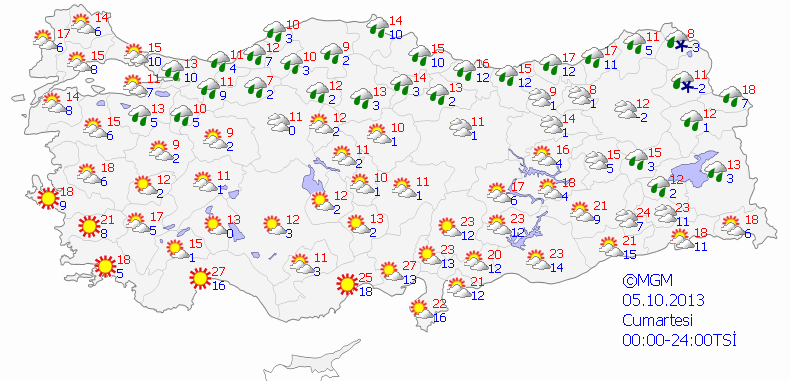 Yapılan son değerlendirmelere göre; Marmara'nın doğusu, Ege, Akdeniz, İç Anadolu, Karadeniz ile Balıkesir, Malatya, Erzurum, Erzincan, Tunceli, Gaziantep, Adıyaman ve Kilis çevrelerinin aralıklı sağanak ve yer yer gök gürültülü sağanak yağışlı geçeceği tahmin ediliyor. Yağışların; Antalya'nın doğu kesimlerinde çok kuvvetli olmak üzere, Antalya, Isparta, Burdur, Adana, Osmaniye, Kayseri, Yozgat'ın güneyi, Sinop, Samsun, Ordu ve Ankara ile gece saatlerinden sonra Giresun, Düzce, Zonguldak ve Bartın çevrelerinde kuvvetli olması bekleniyor.