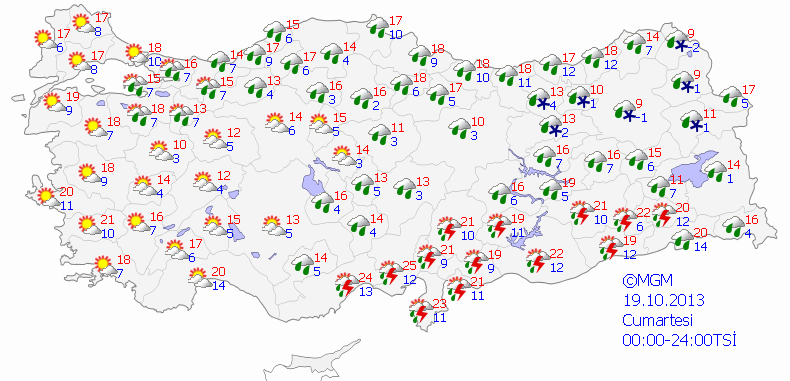 Yapılan son değerlendirmelere göre; öğle saatlerinden itibaren yurdun batı kesimleri yeni bir yağışlı havanın etkisine girecek. Marmara, Ege, Antalya, Göller Yöresi, Zonguldak, Bolu, Düzce, Bartın ve Eskişehir çevrelerinde görülecek sağanak ve gök gürültülü sağanak yağışların, Çanakkale, Balıkesir, izmir, Manisa, Aydın ve Muğla çevrelerinde kuvvetli olması tahmin ediliyor.