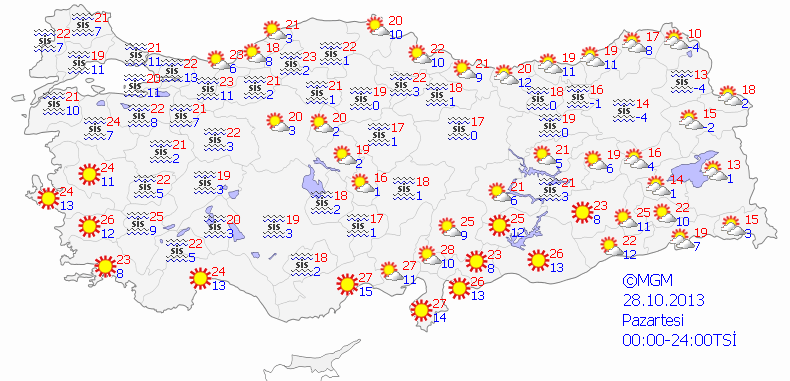 Yapılan son değerlendirmelere göre; Ülkemizin doğu kesimleri parçalı ve yer yer çok bulutlu, Rize, Artvin'in kıyı ilçeleri, Van ve Bitlis çevrelerinin yağmur ve sağanak yağışlı, diğer yerlerin az bulutlu ve açık geçeceği tahmin ediliyor. Sabah ve gece saatlerinde Marmara ile iç bölgelerde yer yer pus ve sis hadisesi bekleniyor.