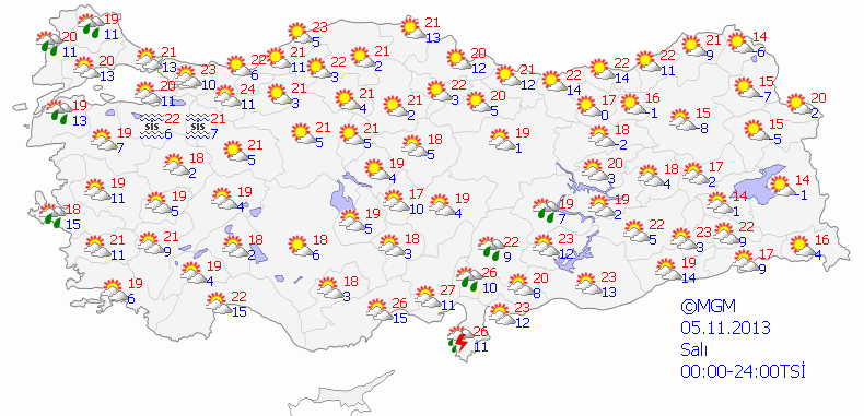 Yapılan son değerlendirmelere göre; Kıyı Ege, Çanakkale, Edirne, Kırklareli, Hatay, Osmaniye, Kahramanmaraş ve Adana'nın doğu ilçeleri ile Malatya çevrelerinin kısa süreli ve yerel olmak üzere sağanak yağışlı geçeceği tahmin ediliyor. Sabah ve gece saatlerinde Batı Karadeniz'in iç kesimleri ile Bursa ve Bilecik çevrelerinde yer yer pus ve sis hadisesi bekleniyor.